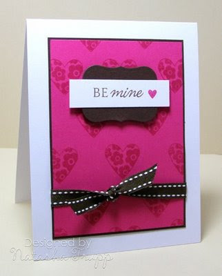 Supplies: Stamps: Heart Prints (PTI) Ink: Raspberry Fizz, Dark Chocolate Paper: Raspberry Fizz, Dark Chocolate, White Accessories, etc.: pop dots, nesties labels 1, saddle stitched grosgrain