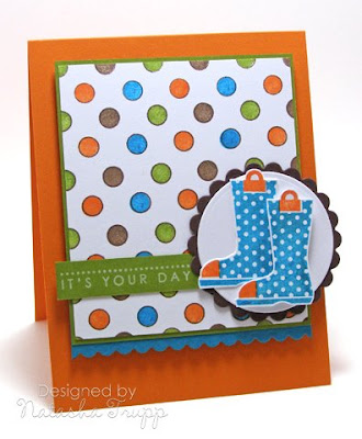 For the second card I did something that I've been wanting to do forever, but for some reason the execution of it just never occurred to me. I love polka dot backgrounds, but I've been wanting multi-coloured dot backgrounds. I was checking out some new-to-me blogs, and came across Laura's, this post in particular, was kind of an "oh yeah" moment. Use the outline polka dot backgrounds and just stamp in your own colour. I suppose if you really didn't want the colour to show you could stamp in versamark and just use it as a guide. I was okay with the outline showing here. With all the fun spring stuff around (and we're finally getting weather forecasts into the double digits!), I decided to pair the dotty background with a few garden boots. I really love these boots. I modified the sketch ever so slightly. Instead of a flower and leaves, I used a scalloped circle. And because my sentiment was too long, I had it flow over the edge of the background piece, since it wouldn't look right hugged up to the edge of the mat.